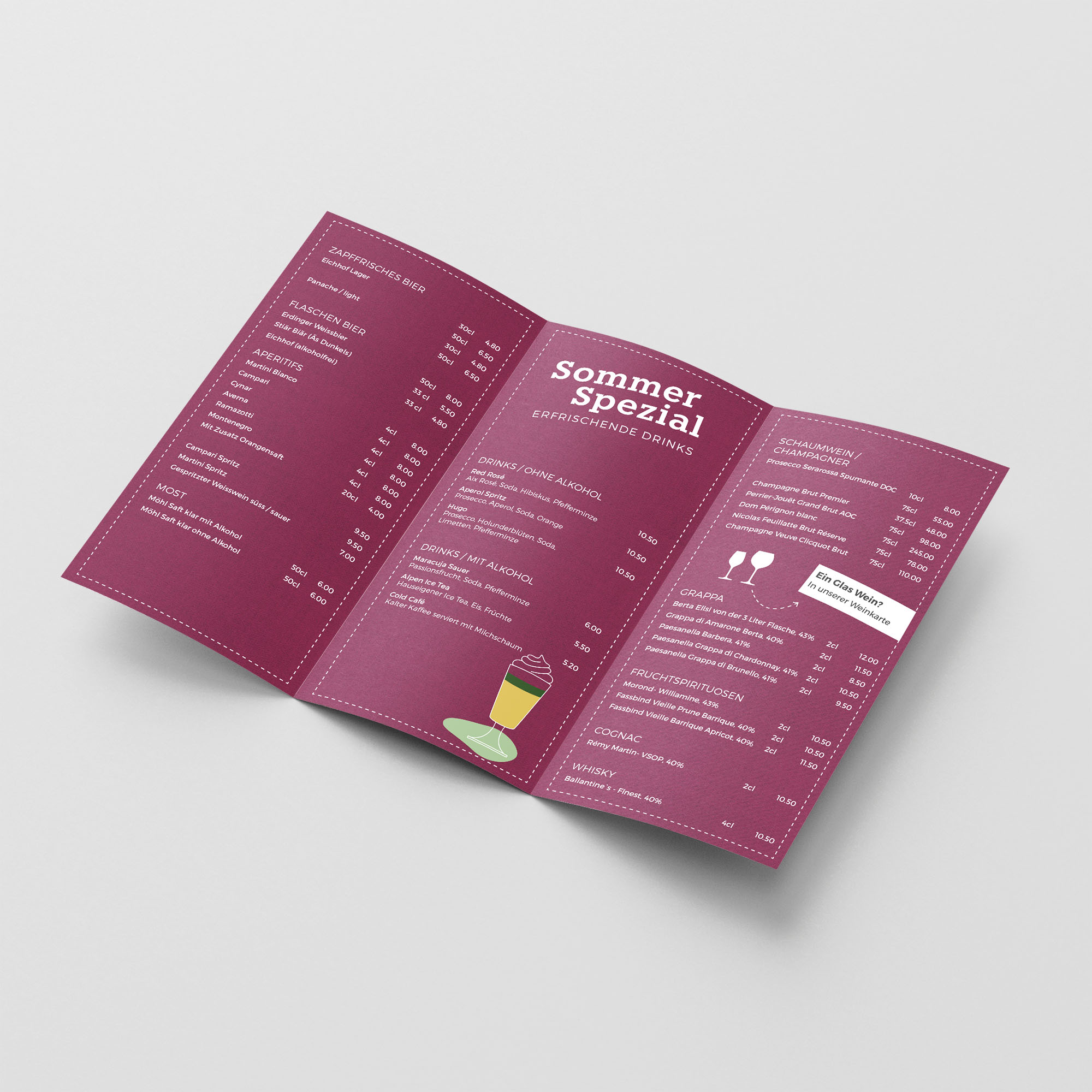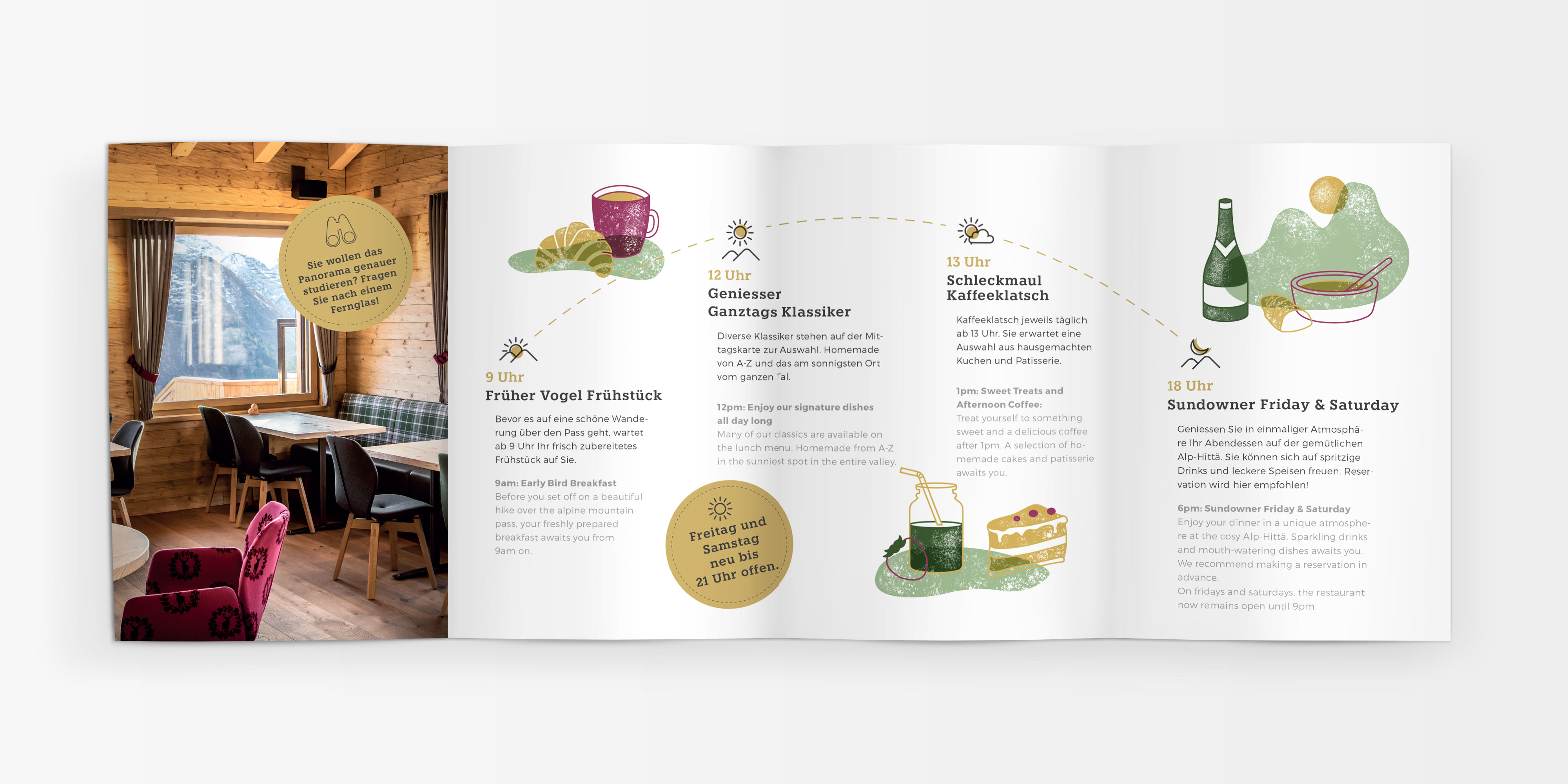 Ettii, ein Auftritt der obenauf schwingt. Für die Alphittä Andermatt wurde ein passendes Erscheinungsbild entwickelt und umgesetzt. Mit der Illustrationswelt lassen sich die Informationen funktional an den Gast weitergeben. Das Restaurant wurde mittlerweile in die «Gilde Restaurants» aufgenommen.